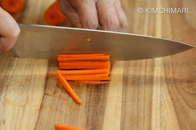- While mushrooms are soaking, peel and julienne Carrot, Zucchini and Daikon radish. Use a mandoline slicer for the most uniform and pretty cuts. But probably carrots are more easily cut with a knife as they may be too hard for the mandoline.