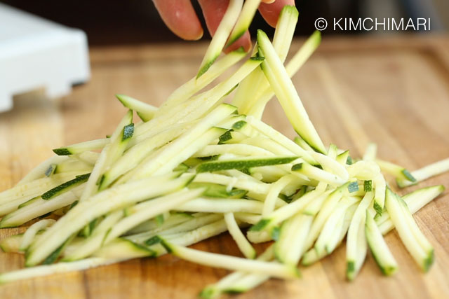 - Zucchini: Heat about 1 Tbs vegetable oil in frying pan on medium heat. Saute julienned Zucchini. Sprinkle some sea salt. Cook for 2-3 minutes until zucchinis are soft. Transfer to a plate and set aside.